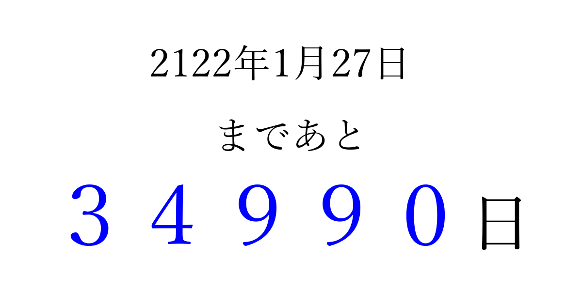 2122年1月27日(火)まで あと 99999 日です 追加すると、トップページからすぐ選べるようになります ※2026/04/10現在の結果です。 最新の状態に更新する ↓シェアして、タイムライン上にカウントダウンを表示しよう!↓ 📤 この結果を共有する Tweet シェア Threads Bluesky 別の日付でカウントダウン 2122年1月のカレンダー このページをブックマークに追加すると、いつでもカウントダウンを確認できます。 (PC: Ctrl+D / Mac: ⌘+D) hitome-notes.comでは以下のページも運営しています。 指定日と期間から日付を計算 | ガチャ確率計算・シミュレーション | プライバシー・ポリシー 運営者:Avocado