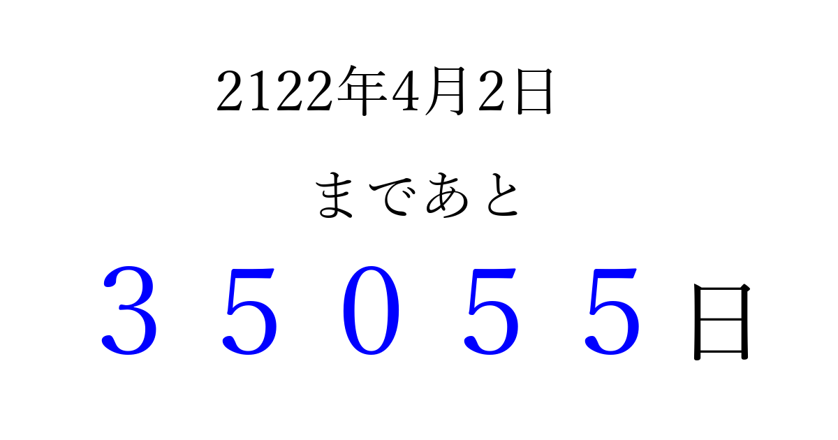 2122年4月2日(木)まで あと 99999 日です 追加すると、トップページからすぐ選べるようになります ※2026/04/10現在の結果です。 最新の状態に更新する ↓シェアして、タイムライン上にカウントダウンを表示しよう!↓ 📤 この結果を共有する Tweet シェア Threads Bluesky 別の日付でカウントダウン 2122年4月のカレンダー このページをブックマークに追加すると、いつでもカウントダウンを確認できます。 (PC: Ctrl+D / Mac: ⌘+D) hitome-notes.comでは以下のページも運営しています。 指定日と期間から日付を計算 | ガチャ確率計算・シミュレーション | プライバシー・ポリシー 運営者:Avocado