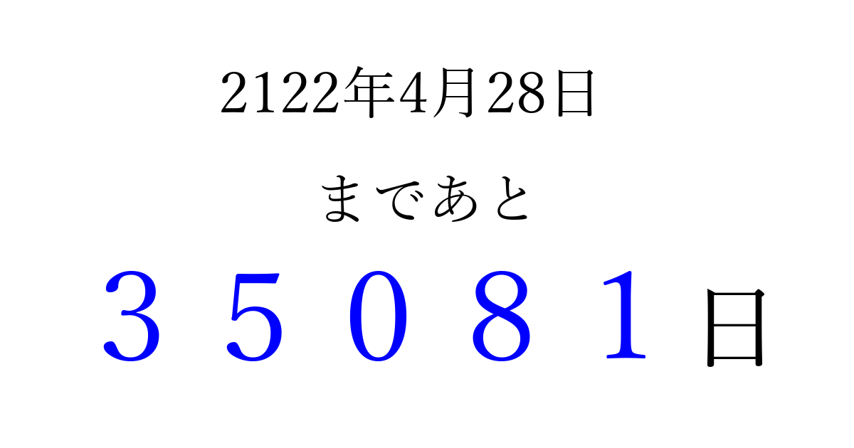 2122年4月28日(火)まで あと 99999 日です 追加すると、トップページからすぐ選べるようになります ※2026/04/10現在の結果です。 最新の状態に更新する ↓シェアして、タイムライン上にカウントダウンを表示しよう!↓ 📤 この結果を共有する Tweet シェア Threads Bluesky 別の日付でカウントダウン 2122年4月のカレンダー このページをブックマークに追加すると、いつでもカウントダウンを確認できます。 (PC: Ctrl+D / Mac: ⌘+D) hitome-notes.comでは以下のページも運営しています。 指定日と期間から日付を計算 | ガチャ確率計算・シミュレーション | プライバシー・ポリシー 運営者:Avocado
