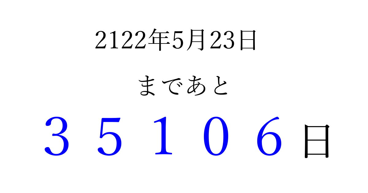 2122年5月23日(土)まで あと 99999 日です 追加すると、トップページからすぐ選べるようになります ※2026/04/10現在の結果です。 最新の状態に更新する ↓シェアして、タイムライン上にカウントダウンを表示しよう!↓ 📤 この結果を共有する Tweet シェア Threads Bluesky 別の日付でカウントダウン 2122年5月のカレンダー このページをブックマークに追加すると、いつでもカウントダウンを確認できます。 (PC: Ctrl+D / Mac: ⌘+D) hitome-notes.comでは以下のページも運営しています。 指定日と期間から日付を計算 | ガチャ確率計算・シミュレーション | プライバシー・ポリシー 運営者:Avocado