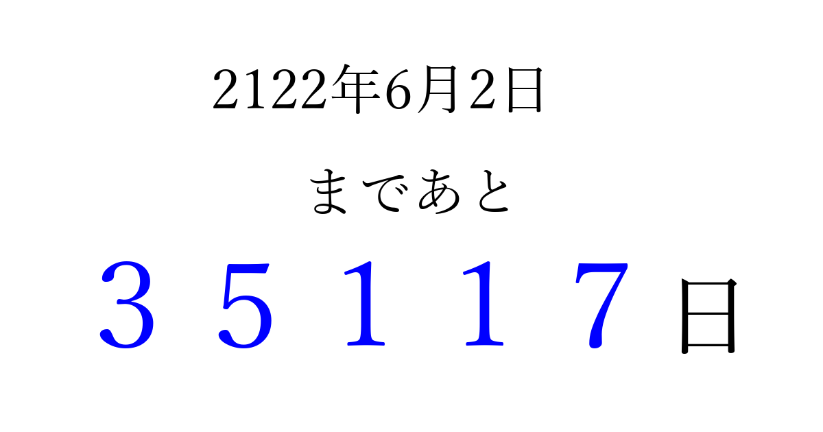 2122年6月2日(火)まで あと 99999 日です 追加すると、トップページからすぐ選べるようになります ※2026/04/09現在の結果です。 最新の状態に更新する ↓シェアして、タイムライン上にカウントダウンを表示しよう!↓ 📤 この結果を共有する Tweet シェア Threads Bluesky 別の日付でカウントダウン 2122年6月のカレンダー このページをブックマークに追加すると、いつでもカウントダウンを確認できます。 (PC: Ctrl+D / Mac: ⌘+D) hitome-notes.comでは以下のページも運営しています。 指定日と期間から日付を計算 | ガチャ確率計算・シミュレーション | プライバシー・ポリシー 運営者:Avocado