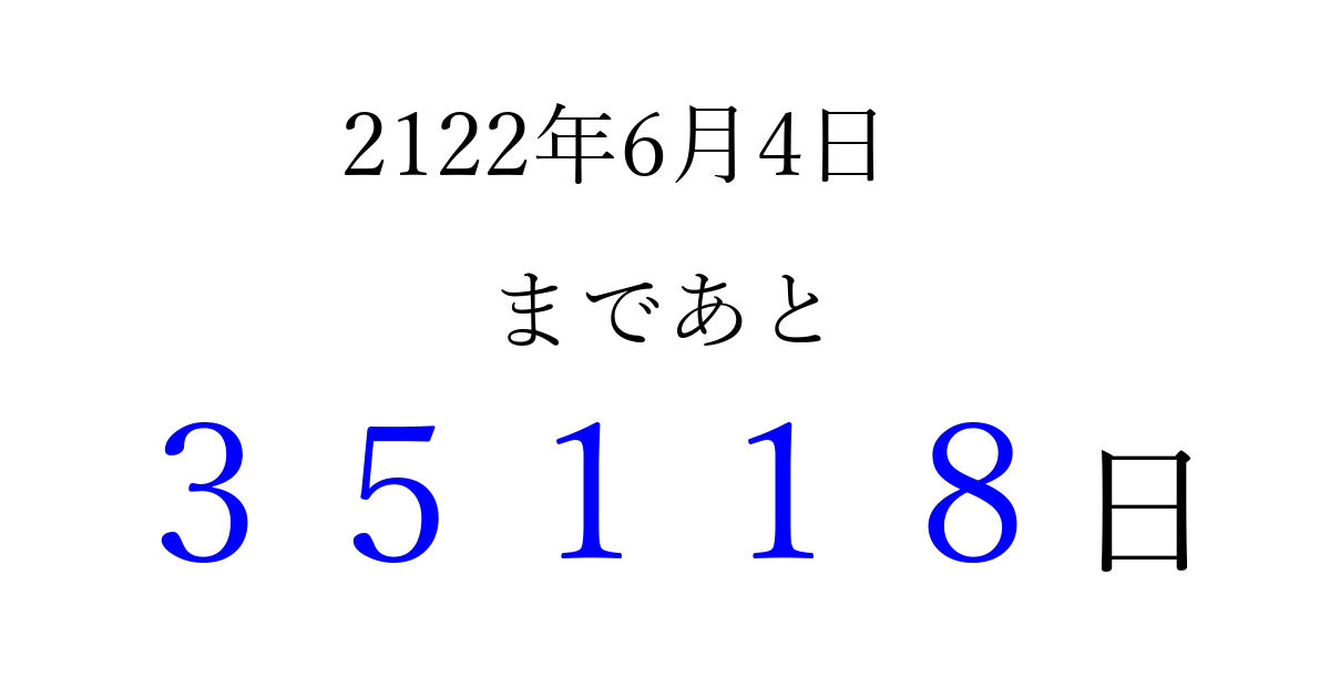2122年6月4日(木)まで あと 99999 日です 追加すると、トップページからすぐ選べるようになります ※2026/04/10現在の結果です。 最新の状態に更新する ↓シェアして、タイムライン上にカウントダウンを表示しよう!↓ 📤 この結果を共有する Tweet シェア Threads Bluesky 別の日付でカウントダウン 2122年6月のカレンダー このページをブックマークに追加すると、いつでもカウントダウンを確認できます。 (PC: Ctrl+D / Mac: ⌘+D) hitome-notes.comでは以下のページも運営しています。 指定日と期間から日付を計算 | ガチャ確率計算・シミュレーション | プライバシー・ポリシー 運営者:Avocado