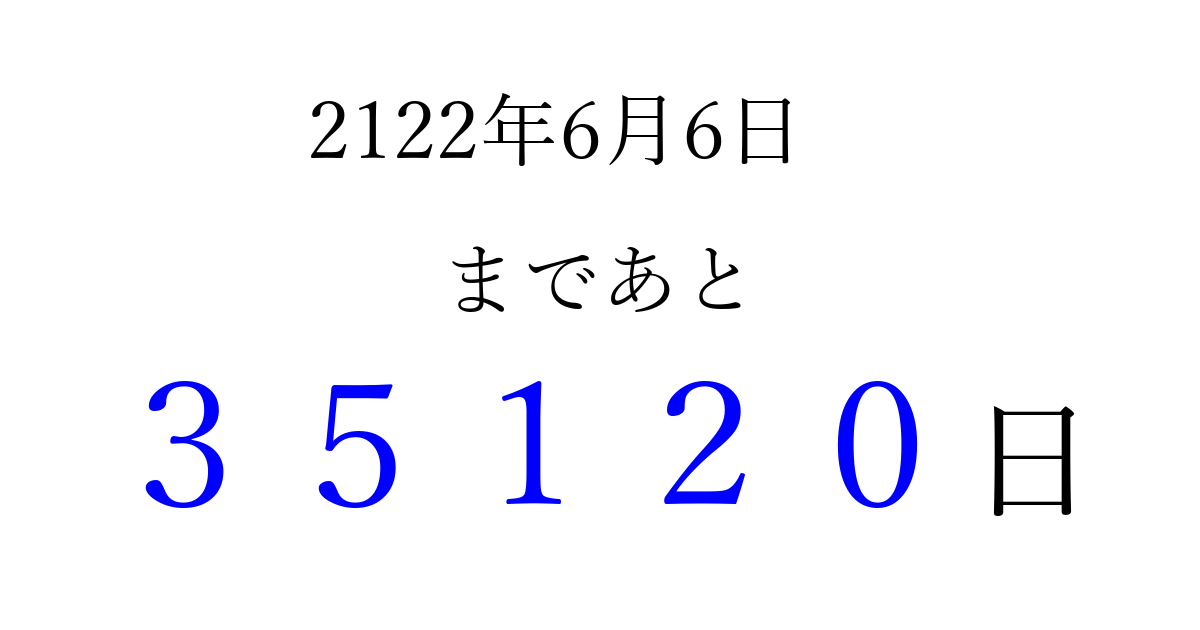 2122年6月6日(土)まで あと 99999 日です 追加すると、トップページからすぐ選べるようになります ※2026/04/10現在の結果です。 最新の状態に更新する ↓シェアして、タイムライン上にカウントダウンを表示しよう!↓ 📤 この結果を共有する Tweet シェア Threads Bluesky 別の日付でカウントダウン 2122年6月のカレンダー このページをブックマークに追加すると、いつでもカウントダウンを確認できます。 (PC: Ctrl+D / Mac: ⌘+D) hitome-notes.comでは以下のページも運営しています。 指定日と期間から日付を計算 | ガチャ確率計算・シミュレーション | プライバシー・ポリシー 運営者:Avocado