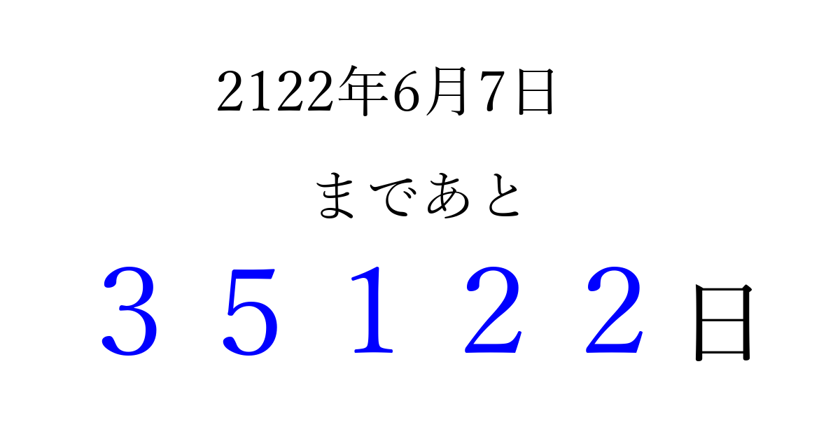 2122年6月7日(日)まで あと 99999 日です 追加すると、トップページからすぐ選べるようになります ※2026/04/09現在の結果です。 最新の状態に更新する ↓シェアして、タイムライン上にカウントダウンを表示しよう!↓ 📤 この結果を共有する Tweet シェア Threads Bluesky 別の日付でカウントダウン 2122年6月のカレンダー このページをブックマークに追加すると、いつでもカウントダウンを確認できます。 (PC: Ctrl+D / Mac: ⌘+D) hitome-notes.comでは以下のページも運営しています。 指定日と期間から日付を計算 | ガチャ確率計算・シミュレーション | プライバシー・ポリシー 運営者:Avocado
