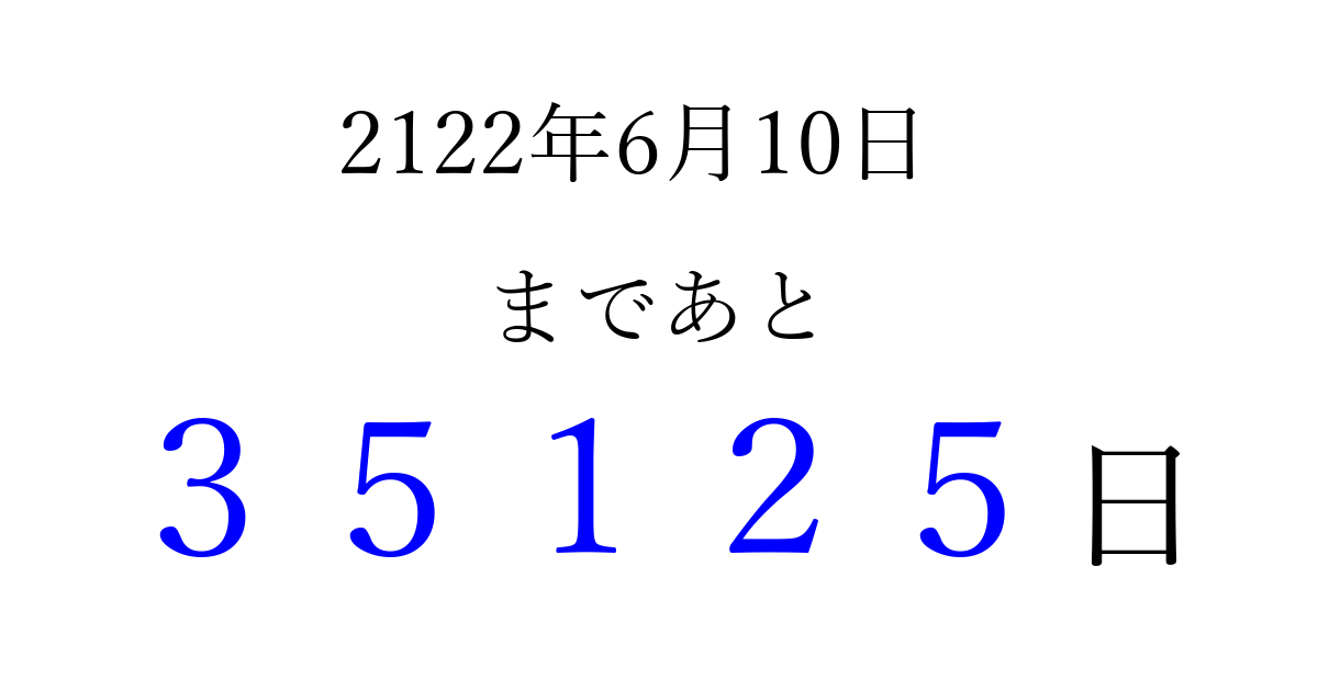 2122年6月10日(水)まで あと 99999 日です 追加すると、トップページからすぐ選べるようになります ※2026/04/09現在の結果です。 最新の状態に更新する ↓シェアして、タイムライン上にカウントダウンを表示しよう!↓ 📤 この結果を共有する Tweet シェア Threads Bluesky 別の日付でカウントダウン 2122年6月のカレンダー このページをブックマークに追加すると、いつでもカウントダウンを確認できます。 (PC: Ctrl+D / Mac: ⌘+D) hitome-notes.comでは以下のページも運営しています。 指定日と期間から日付を計算 | ガチャ確率計算・シミュレーション | プライバシー・ポリシー 運営者:Avocado