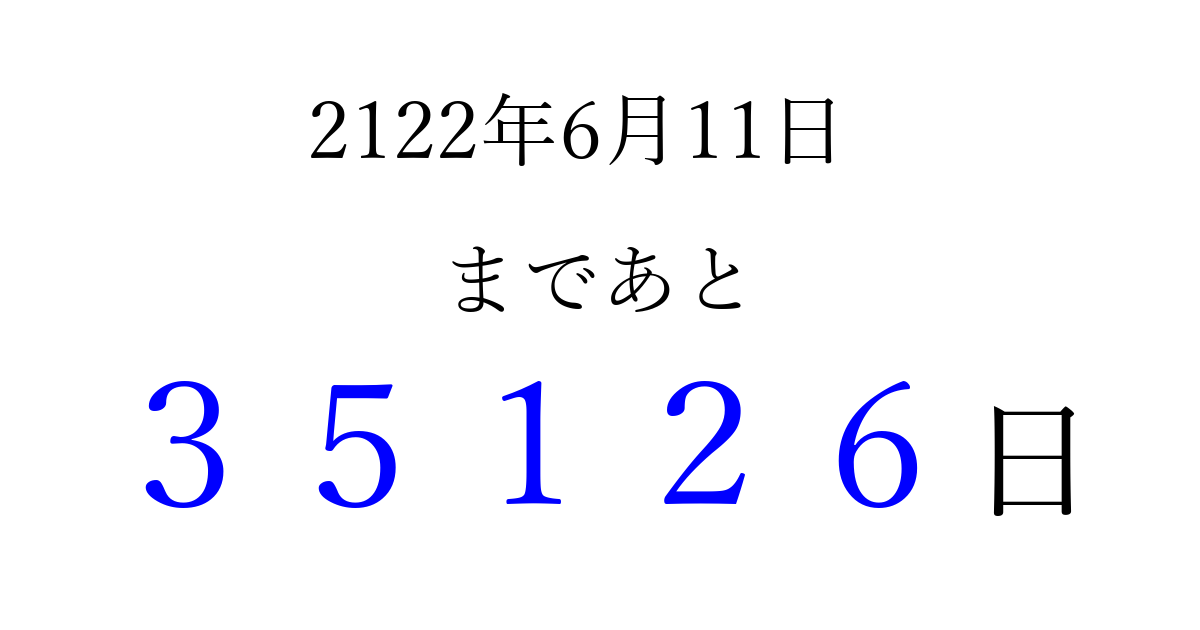 2122年6月11日(木)まで あと 99999 日です 追加すると、トップページからすぐ選べるようになります ※2026/04/09現在の結果です。 最新の状態に更新する ↓シェアして、タイムライン上にカウントダウンを表示しよう!↓ 📤 この結果を共有する Tweet シェア Threads Bluesky 別の日付でカウントダウン 2122年6月のカレンダー このページをブックマークに追加すると、いつでもカウントダウンを確認できます。 (PC: Ctrl+D / Mac: ⌘+D) hitome-notes.comでは以下のページも運営しています。 指定日と期間から日付を計算 | ガチャ確率計算・シミュレーション | プライバシー・ポリシー 運営者:Avocado