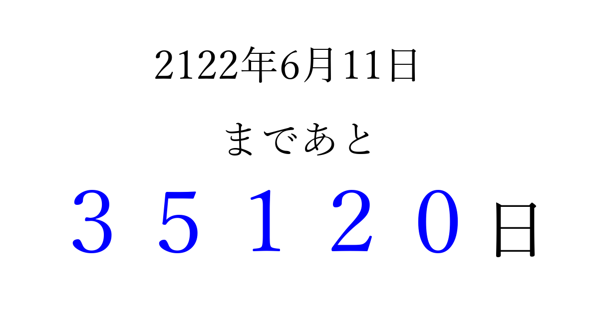 2122年6月11日(木)まで あと 99999 日です 追加すると、トップページからすぐ選べるようになります ※2026/04/15現在の結果です。 最新の状態に更新する ↓シェアして、タイムライン上にカウントダウンを表示しよう!↓ 📤 この結果を共有する Tweet シェア Threads Bluesky 別の日付でカウントダウン 2122年6月のカレンダー このページをブックマークに追加すると、いつでもカウントダウンを確認できます。 (PC: Ctrl+D / Mac: ⌘+D) hitome-notes.comでは以下のページも運営しています。 指定日と期間から日付を計算 | ガチャ確率計算・シミュレーション | プライバシー・ポリシー 運営者:Avocado