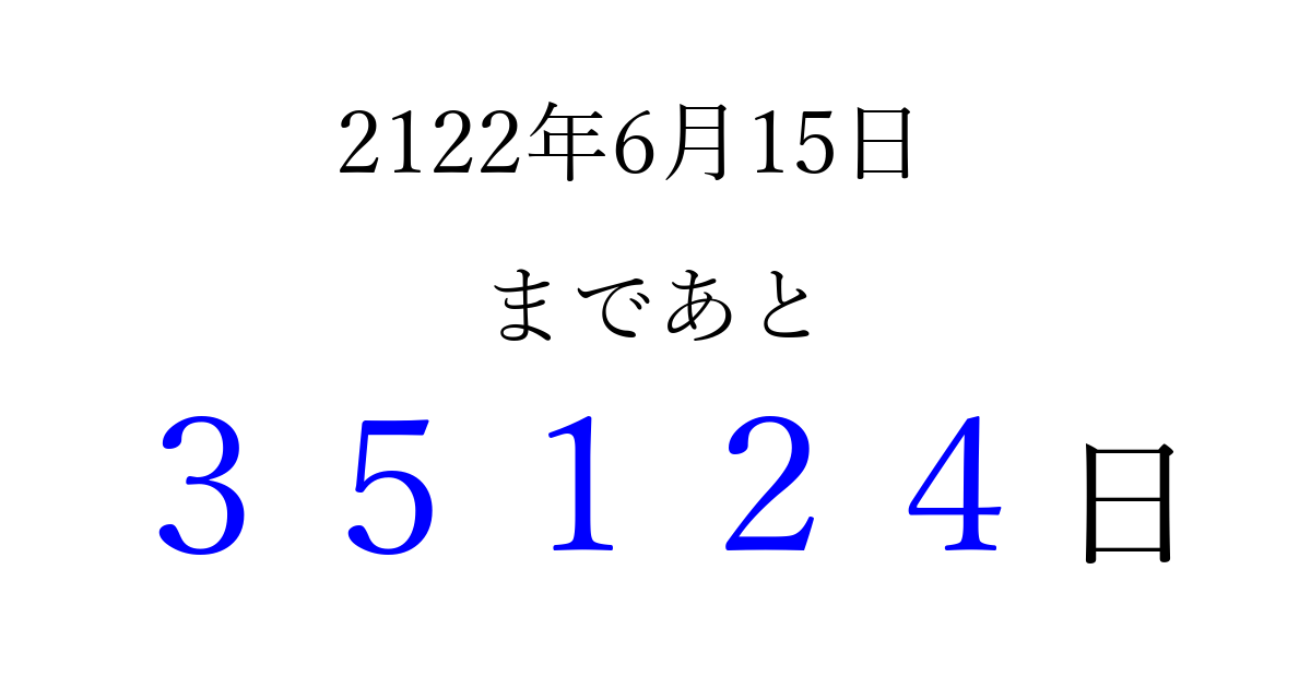 2122年6月15日(月)まで あと 99999 日です 追加すると、トップページからすぐ選べるようになります ※2026/04/15現在の結果です。 最新の状態に更新する ↓シェアして、タイムライン上にカウントダウンを表示しよう!↓ 📤 この結果を共有する Tweet シェア Threads Bluesky 別の日付でカウントダウン 2122年6月のカレンダー このページをブックマークに追加すると、いつでもカウントダウンを確認できます。 (PC: Ctrl+D / Mac: ⌘+D) hitome-notes.comでは以下のページも運営しています。 指定日と期間から日付を計算 | ガチャ確率計算・シミュレーション | プライバシー・ポリシー 運営者:Avocado