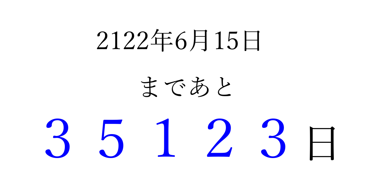 2122年6月15日(月)まで あと 99999 日です 追加すると、トップページからすぐ選べるようになります ※2026/04/16現在の結果です。 最新の状態に更新する ↓シェアして、タイムライン上にカウントダウンを表示しよう!↓ 📤 この結果を共有する Tweet シェア Threads Bluesky 別の日付でカウントダウン 2122年6月のカレンダー このページをブックマークに追加すると、いつでもカウントダウンを確認できます。 (PC: Ctrl+D / Mac: ⌘+D) hitome-notes.comでは以下のページも運営しています。 指定日と期間から日付を計算 | ガチャ確率計算・シミュレーション | プライバシー・ポリシー 運営者:Avocado