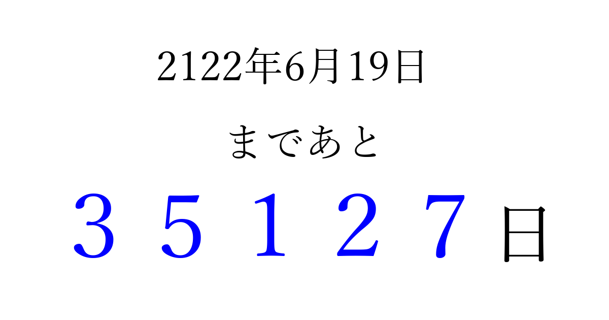 2122年6月19日(金)まで あと 99999 日です 追加すると、トップページからすぐ選べるようになります ※2026/04/16現在の結果です。 最新の状態に更新する ↓シェアして、タイムライン上にカウントダウンを表示しよう!↓ 📤 この結果を共有する Tweet シェア Threads Bluesky 別の日付でカウントダウン 2122年6月のカレンダー このページをブックマークに追加すると、いつでもカウントダウンを確認できます。 (PC: Ctrl+D / Mac: ⌘+D) hitome-notes.comでは以下のページも運営しています。 指定日と期間から日付を計算 | ガチャ確率計算・シミュレーション | プライバシー・ポリシー 運営者:Avocado