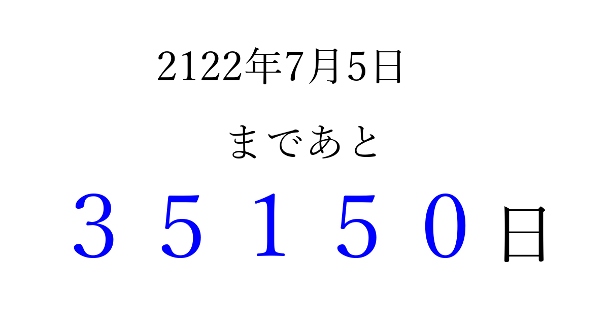 2122年7月5日(日)まで あと 99999 日です 追加すると、トップページからすぐ選べるようになります ※2026/04/09現在の結果です。 最新の状態に更新する ↓シェアして、タイムライン上にカウントダウンを表示しよう!↓ 📤 この結果を共有する Tweet シェア Threads Bluesky 別の日付でカウントダウン 2122年7月のカレンダー このページをブックマークに追加すると、いつでもカウントダウンを確認できます。 (PC: Ctrl+D / Mac: ⌘+D) hitome-notes.comでは以下のページも運営しています。 指定日と期間から日付を計算 | ガチャ確率計算・シミュレーション | プライバシー・ポリシー 運営者:Avocado