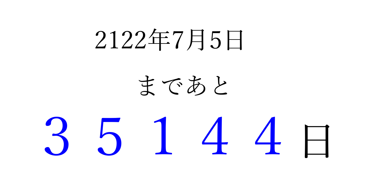 2122年7月5日(日)まで あと 99999 日です 追加すると、トップページからすぐ選べるようになります ※2026/04/15現在の結果です。 最新の状態に更新する ↓シェアして、タイムライン上にカウントダウンを表示しよう!↓ 📤 この結果を共有する Tweet シェア Threads Bluesky 別の日付でカウントダウン 2122年7月のカレンダー このページをブックマークに追加すると、いつでもカウントダウンを確認できます。 (PC: Ctrl+D / Mac: ⌘+D) hitome-notes.comでは以下のページも運営しています。 指定日と期間から日付を計算 | ガチャ確率計算・シミュレーション | プライバシー・ポリシー 運営者:Avocado