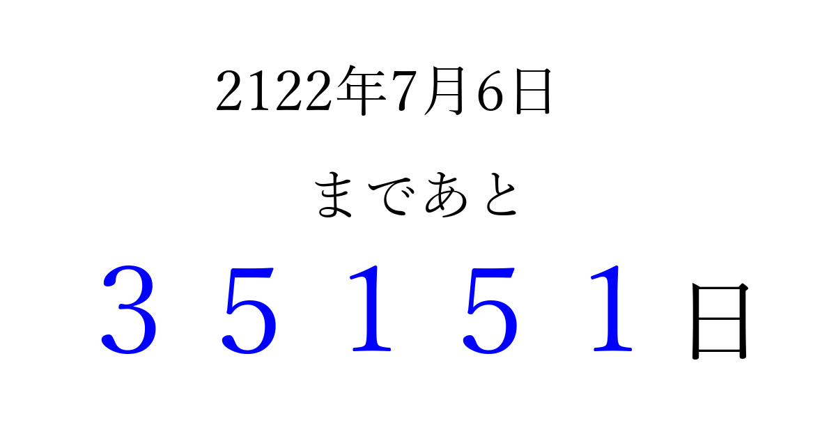2122年7月6日(月)まで あと 99999 日です 追加すると、トップページからすぐ選べるようになります ※2026/04/09現在の結果です。 最新の状態に更新する ↓シェアして、タイムライン上にカウントダウンを表示しよう!↓ 📤 この結果を共有する Tweet シェア Threads Bluesky 別の日付でカウントダウン 2122年7月のカレンダー このページをブックマークに追加すると、いつでもカウントダウンを確認できます。 (PC: Ctrl+D / Mac: ⌘+D) hitome-notes.comでは以下のページも運営しています。 指定日と期間から日付を計算 | ガチャ確率計算・シミュレーション | プライバシー・ポリシー 運営者:Avocado