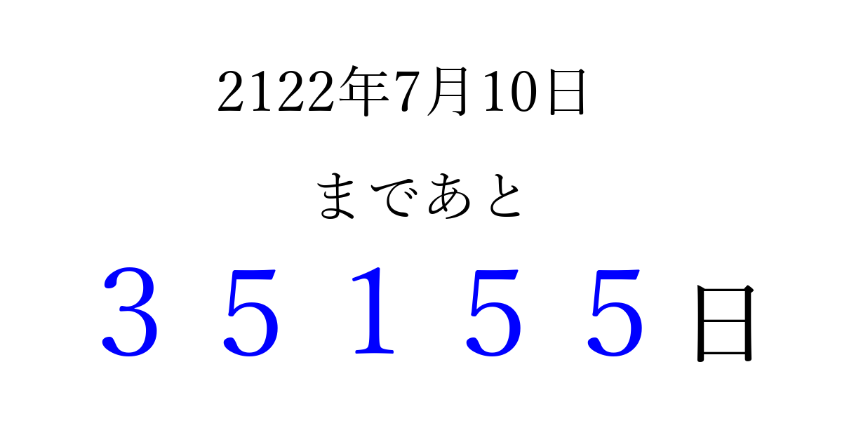 2122年7月10日(金)まで あと 99999 日です 追加すると、トップページからすぐ選べるようになります ※2026/04/09現在の結果です。 最新の状態に更新する ↓シェアして、タイムライン上にカウントダウンを表示しよう!↓ 📤 この結果を共有する Tweet シェア Threads Bluesky 別の日付でカウントダウン 2122年7月のカレンダー このページをブックマークに追加すると、いつでもカウントダウンを確認できます。 (PC: Ctrl+D / Mac: ⌘+D) hitome-notes.comでは以下のページも運営しています。 指定日と期間から日付を計算 | ガチャ確率計算・シミュレーション | プライバシー・ポリシー 運営者:Avocado