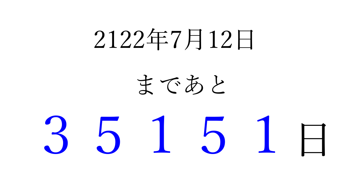 2122年7月12日(日)まで あと 99999 日です 追加すると、トップページからすぐ選べるようになります ※2026/04/15現在の結果です。 最新の状態に更新する ↓シェアして、タイムライン上にカウントダウンを表示しよう!↓ 📤 この結果を共有する Tweet シェア Threads Bluesky 別の日付でカウントダウン 2122年7月のカレンダー このページをブックマークに追加すると、いつでもカウントダウンを確認できます。 (PC: Ctrl+D / Mac: ⌘+D) hitome-notes.comでは以下のページも運営しています。 指定日と期間から日付を計算 | ガチャ確率計算・シミュレーション | プライバシー・ポリシー 運営者:Avocado