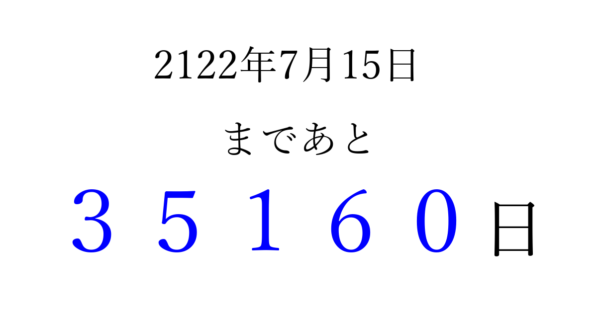 2122年7月15日(水)まで あと 99999 日です 追加すると、トップページからすぐ選べるようになります ※2026/04/09現在の結果です。 最新の状態に更新する ↓シェアして、タイムライン上にカウントダウンを表示しよう!↓ 📤 この結果を共有する Tweet シェア Threads Bluesky 別の日付でカウントダウン 2122年7月のカレンダー このページをブックマークに追加すると、いつでもカウントダウンを確認できます。 (PC: Ctrl+D / Mac: ⌘+D) hitome-notes.comでは以下のページも運営しています。 指定日と期間から日付を計算 | ガチャ確率計算・シミュレーション | プライバシー・ポリシー 運営者:Avocado