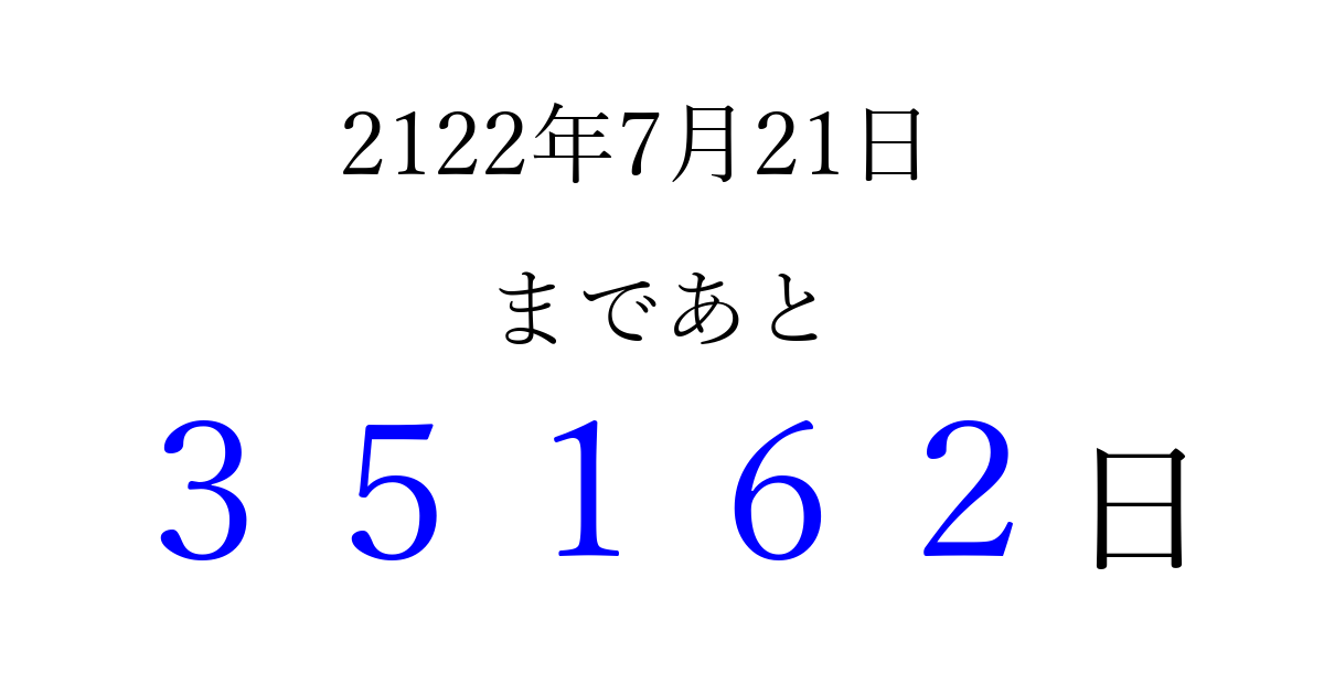 2122年7月21日(火)まで あと 99999 日です 追加すると、トップページからすぐ選べるようになります ※2026/04/13現在の結果です。 最新の状態に更新する ↓シェアして、タイムライン上にカウントダウンを表示しよう!↓ 📤 この結果を共有する Tweet シェア Threads Bluesky 別の日付でカウントダウン 2122年7月のカレンダー このページをブックマークに追加すると、いつでもカウントダウンを確認できます。 (PC: Ctrl+D / Mac: ⌘+D) hitome-notes.comでは以下のページも運営しています。 指定日と期間から日付を計算 | ガチャ確率計算・シミュレーション | プライバシー・ポリシー 運営者:Avocado