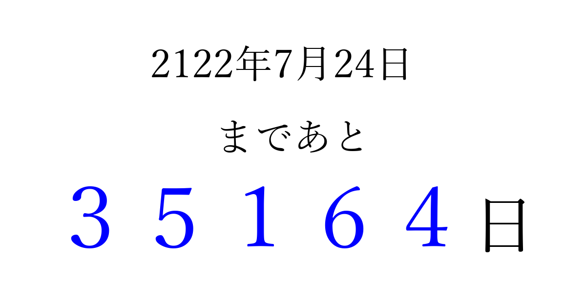 2122年7月24日(金)まで あと 99999 日です 追加すると、トップページからすぐ選べるようになります ※2026/04/14現在の結果です。 最新の状態に更新する ↓シェアして、タイムライン上にカウントダウンを表示しよう!↓ 📤 この結果を共有する Tweet シェア Threads Bluesky 別の日付でカウントダウン 2122年7月のカレンダー このページをブックマークに追加すると、いつでもカウントダウンを確認できます。 (PC: Ctrl+D / Mac: ⌘+D) hitome-notes.comでは以下のページも運営しています。 指定日と期間から日付を計算 | ガチャ確率計算・シミュレーション | プライバシー・ポリシー 運営者:Avocado