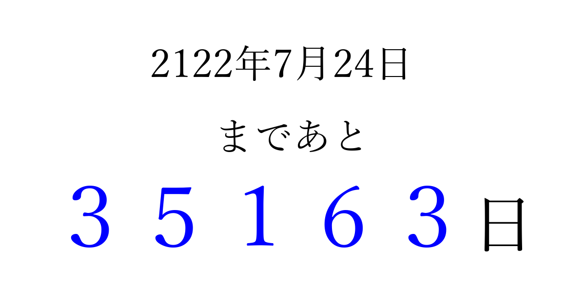 2122年7月24日(金)まで あと 99999 日です 追加すると、トップページからすぐ選べるようになります ※2026/04/15現在の結果です。 最新の状態に更新する ↓シェアして、タイムライン上にカウントダウンを表示しよう!↓ 📤 この結果を共有する Tweet シェア Threads Bluesky 別の日付でカウントダウン 2122年7月のカレンダー このページをブックマークに追加すると、いつでもカウントダウンを確認できます。 (PC: Ctrl+D / Mac: ⌘+D) hitome-notes.comでは以下のページも運営しています。 指定日と期間から日付を計算 | ガチャ確率計算・シミュレーション | プライバシー・ポリシー 運営者:Avocado