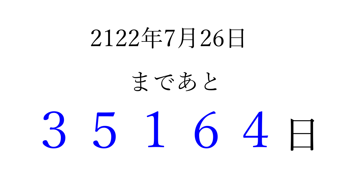 2122年7月26日(日)まで あと 99999 日です 追加すると、トップページからすぐ選べるようになります ※2026/04/16現在の結果です。 最新の状態に更新する ↓シェアして、タイムライン上にカウントダウンを表示しよう!↓ 📤 この結果を共有する Tweet シェア Threads Bluesky 別の日付でカウントダウン 2122年7月のカレンダー このページをブックマークに追加すると、いつでもカウントダウンを確認できます。 (PC: Ctrl+D / Mac: ⌘+D) hitome-notes.comでは以下のページも運営しています。 指定日と期間から日付を計算 | ガチャ確率計算・シミュレーション | プライバシー・ポリシー 運営者:Avocado