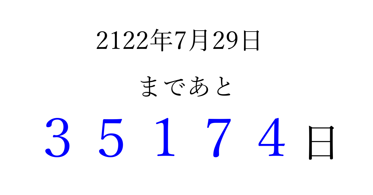 2122年7月29日(水)まで あと 99999 日です 追加すると、トップページからすぐ選べるようになります ※2026/04/09現在の結果です。 最新の状態に更新する ↓シェアして、タイムライン上にカウントダウンを表示しよう!↓ 📤 この結果を共有する Tweet シェア Threads Bluesky 別の日付でカウントダウン 2122年7月のカレンダー このページをブックマークに追加すると、いつでもカウントダウンを確認できます。 (PC: Ctrl+D / Mac: ⌘+D) hitome-notes.comでは以下のページも運営しています。 指定日と期間から日付を計算 | ガチャ確率計算・シミュレーション | プライバシー・ポリシー 運営者:Avocado