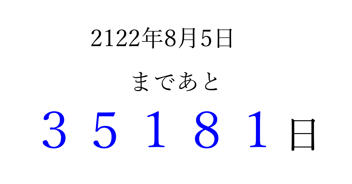 2122年8月5日(水)まで あと 99999 日です 追加すると、トップページからすぐ選べるようになります ※2026/04/09現在の結果です。 最新の状態に更新する ↓シェアして、タイムライン上にカウントダウンを表示しよう!↓ 📤 この結果を共有する Tweet シェア Threads Bluesky 別の日付でカウントダウン 2122年8月のカレンダー このページをブックマークに追加すると、いつでもカウントダウンを確認できます。 (PC: Ctrl+D / Mac: ⌘+D) hitome-notes.comでは以下のページも運営しています。 指定日と期間から日付を計算 | ガチャ確率計算・シミュレーション | プライバシー・ポリシー 運営者:Avocado