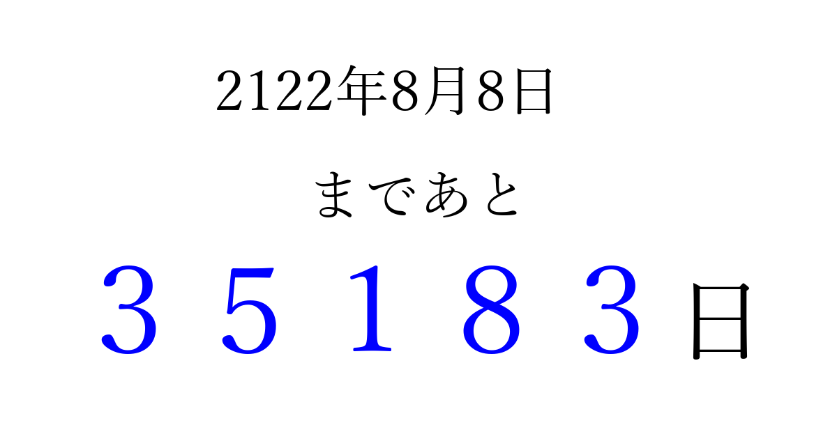 2122年8月8日(土)まで あと 99999 日です 追加すると、トップページからすぐ選べるようになります ※2026/04/10現在の結果です。 最新の状態に更新する ↓シェアして、タイムライン上にカウントダウンを表示しよう!↓ 📤 この結果を共有する Tweet シェア Threads Bluesky 別の日付でカウントダウン 2122年8月のカレンダー このページをブックマークに追加すると、いつでもカウントダウンを確認できます。 (PC: Ctrl+D / Mac: ⌘+D) hitome-notes.comでは以下のページも運営しています。 指定日と期間から日付を計算 | ガチャ確率計算・シミュレーション | プライバシー・ポリシー 運営者:Avocado