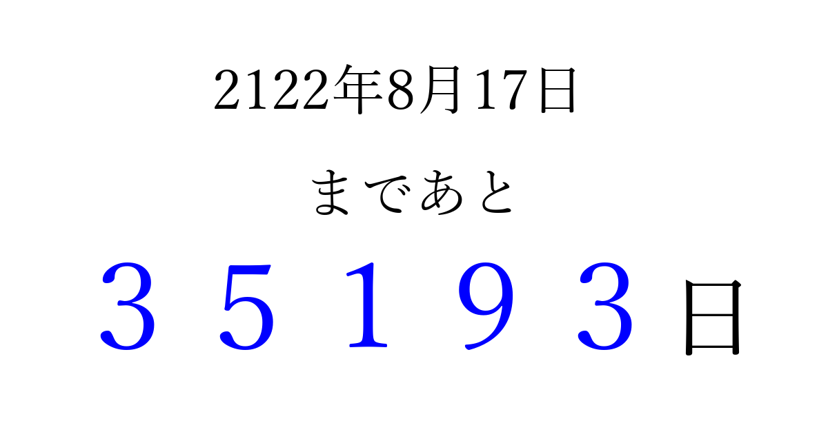 2122年8月17日(月)まで あと 99999 日です 追加すると、トップページからすぐ選べるようになります ※2026/04/09現在の結果です。 最新の状態に更新する ↓シェアして、タイムライン上にカウントダウンを表示しよう!↓ 📤 この結果を共有する Tweet シェア Threads Bluesky 別の日付でカウントダウン 2122年8月のカレンダー このページをブックマークに追加すると、いつでもカウントダウンを確認できます。 (PC: Ctrl+D / Mac: ⌘+D) hitome-notes.comでは以下のページも運営しています。 指定日と期間から日付を計算 | ガチャ確率計算・シミュレーション | プライバシー・ポリシー 運営者:Avocado