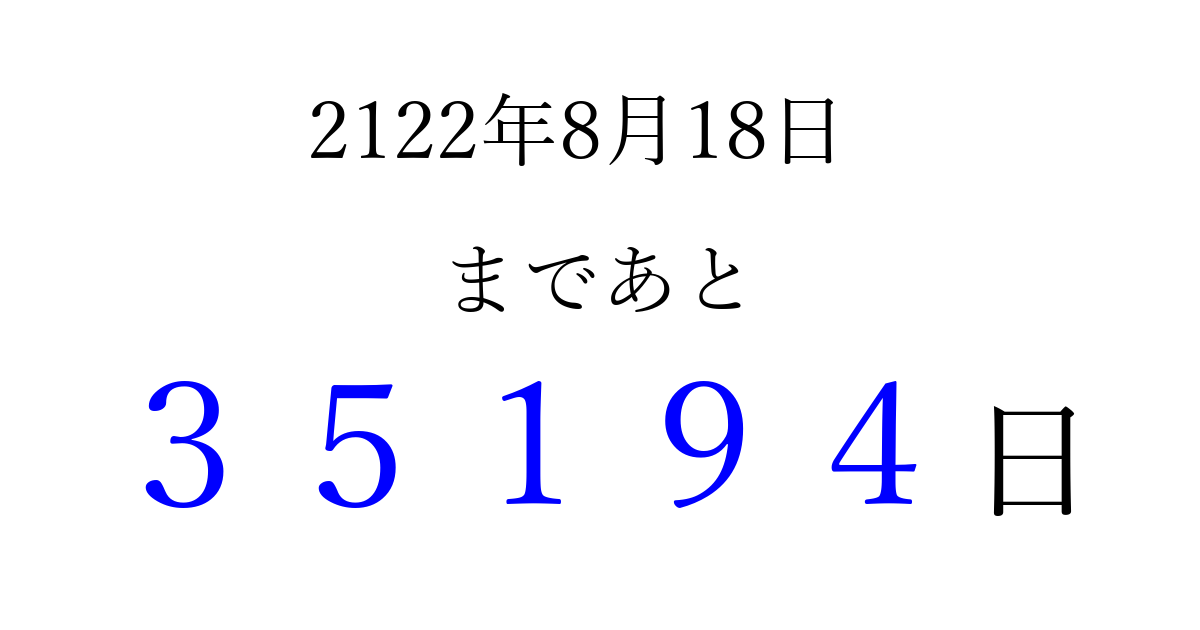 2122年8月18日(火)まで あと 99999 日です 追加すると、トップページからすぐ選べるようになります ※2026/04/09現在の結果です。 最新の状態に更新する ↓シェアして、タイムライン上にカウントダウンを表示しよう!↓ 📤 この結果を共有する Tweet シェア Threads Bluesky 別の日付でカウントダウン 2122年8月のカレンダー このページをブックマークに追加すると、いつでもカウントダウンを確認できます。 (PC: Ctrl+D / Mac: ⌘+D) hitome-notes.comでは以下のページも運営しています。 指定日と期間から日付を計算 | ガチャ確率計算・シミュレーション | プライバシー・ポリシー 運営者:Avocado