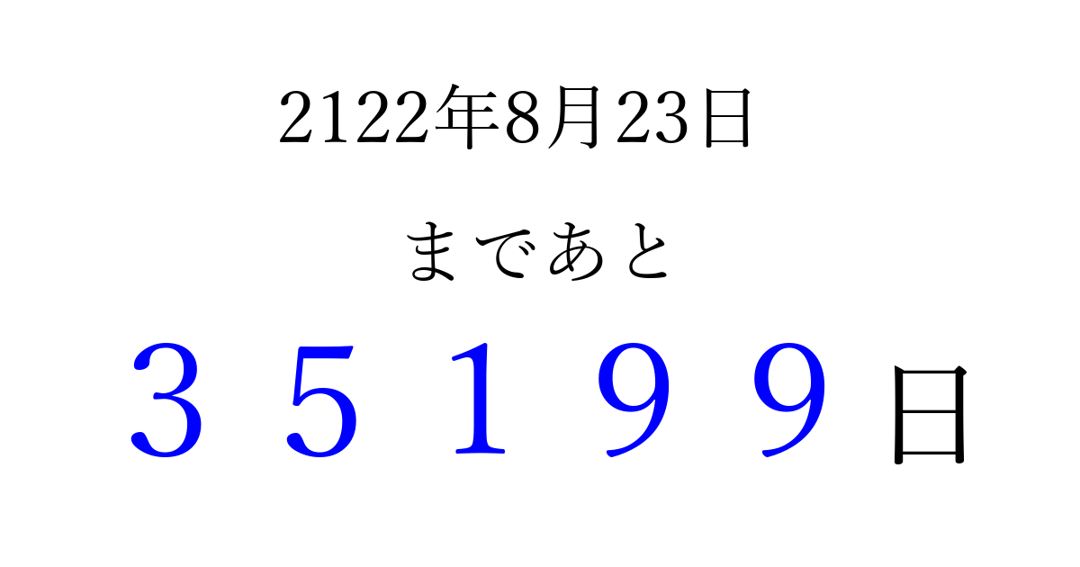 2122年8月23日(日)まで あと 99999 日です 追加すると、トップページからすぐ選べるようになります ※2026/04/09現在の結果です。 最新の状態に更新する ↓シェアして、タイムライン上にカウントダウンを表示しよう!↓ 📤 この結果を共有する Tweet シェア Threads Bluesky 別の日付でカウントダウン 2122年8月のカレンダー このページをブックマークに追加すると、いつでもカウントダウンを確認できます。 (PC: Ctrl+D / Mac: ⌘+D) hitome-notes.comでは以下のページも運営しています。 指定日と期間から日付を計算 | ガチャ確率計算・シミュレーション | プライバシー・ポリシー 運営者:Avocado