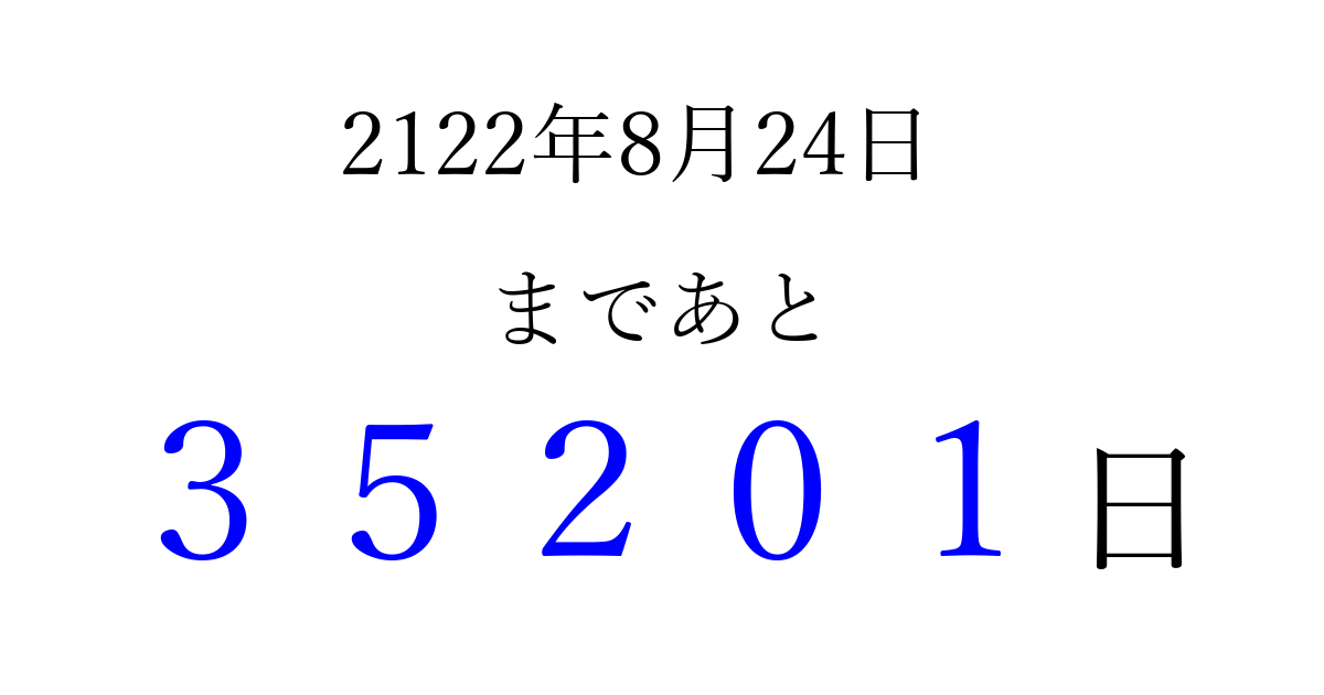 2122年8月24日(月)まで あと 99999 日です 追加すると、トップページからすぐ選べるようになります ※2026/04/08現在の結果です。 最新の状態に更新する ↓シェアして、タイムライン上にカウントダウンを表示しよう!↓ 📤 この結果を共有する Tweet シェア Threads Bluesky 別の日付でカウントダウン 2122年8月のカレンダー このページをブックマークに追加すると、いつでもカウントダウンを確認できます。 (PC: Ctrl+D / Mac: ⌘+D) hitome-notes.comでは以下のページも運営しています。 指定日と期間から日付を計算 | ガチャ確率計算・シミュレーション | プライバシー・ポリシー 運営者:Avocado