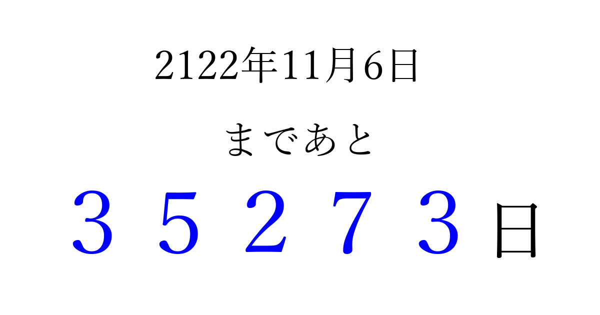 2122年11月6日(金)まで あと 99999 日です 追加すると、トップページからすぐ選べるようになります ※2026/04/10現在の結果です。 最新の状態に更新する ↓シェアして、タイムライン上にカウントダウンを表示しよう!↓ 📤 この結果を共有する Tweet シェア Threads Bluesky 別の日付でカウントダウン 2122年11月のカレンダー このページをブックマークに追加すると、いつでもカウントダウンを確認できます。 (PC: Ctrl+D / Mac: ⌘+D) hitome-notes.comでは以下のページも運営しています。 指定日と期間から日付を計算 | ガチャ確率計算・シミュレーション | プライバシー・ポリシー 運営者:Avocado