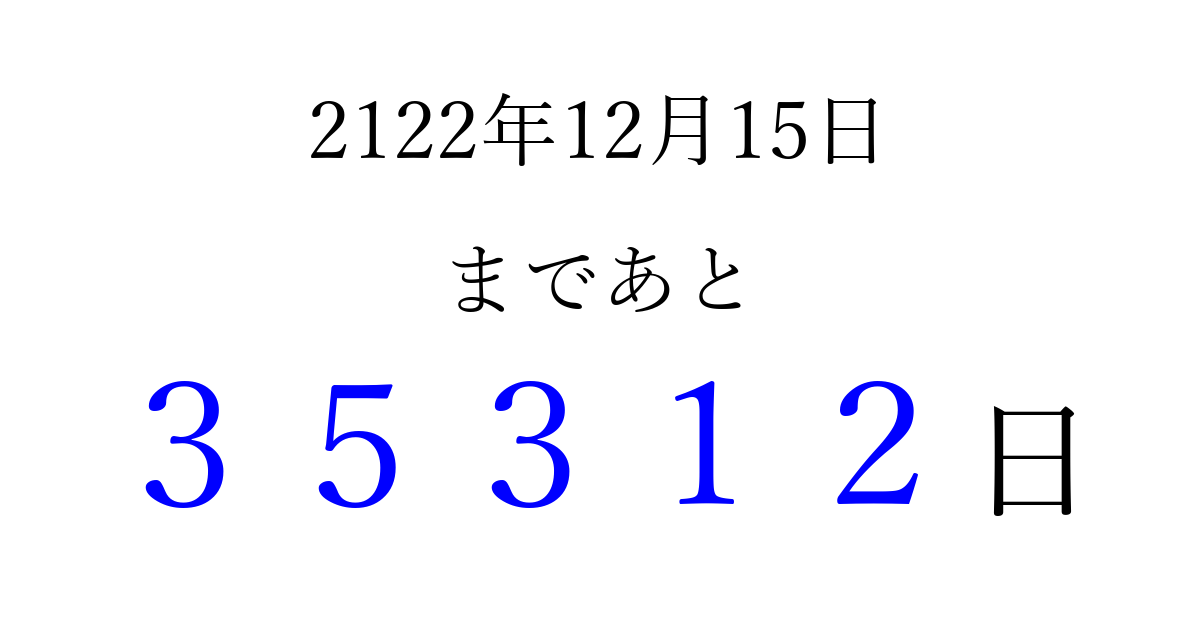 2122年12月15日(火)まで あと 99999 日です 追加すると、トップページからすぐ選べるようになります ※2026/04/10現在の結果です。 最新の状態に更新する ↓シェアして、タイムライン上にカウントダウンを表示しよう!↓ 📤 この結果を共有する Tweet シェア Threads Bluesky 別の日付でカウントダウン 2122年12月のカレンダー このページをブックマークに追加すると、いつでもカウントダウンを確認できます。 (PC: Ctrl+D / Mac: ⌘+D) hitome-notes.comでは以下のページも運営しています。 指定日と期間から日付を計算 | ガチャ確率計算・シミュレーション | プライバシー・ポリシー 運営者:Avocado