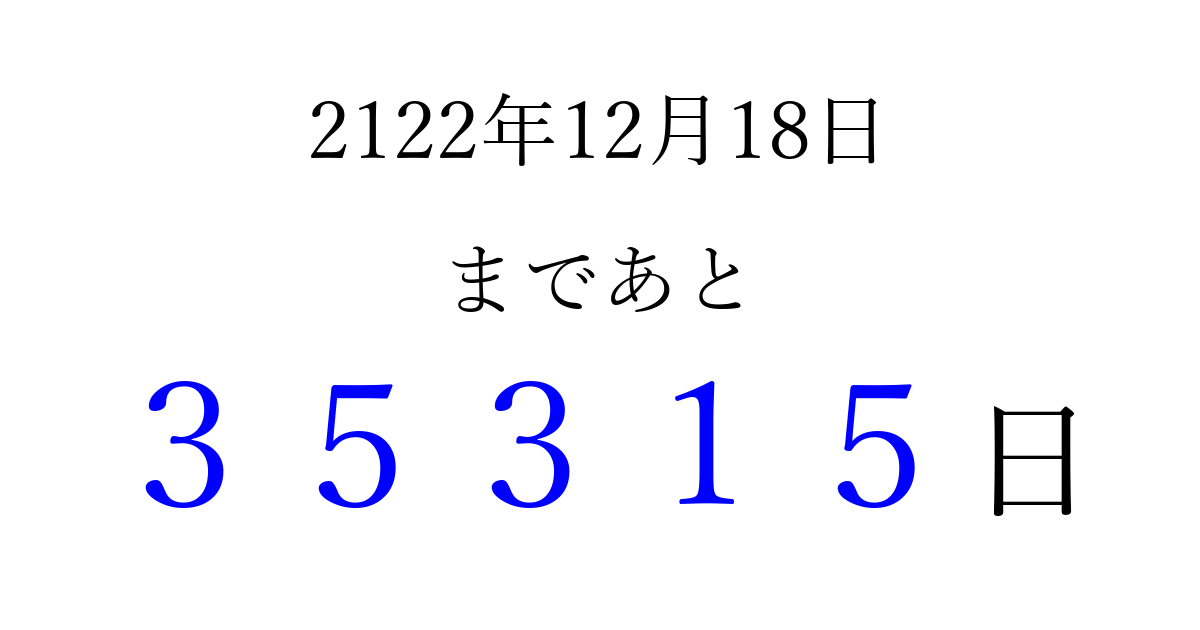 2122年12月18日(金)まで あと 99999 日です 追加すると、トップページからすぐ選べるようになります ※2026/04/10現在の結果です。 最新の状態に更新する ↓シェアして、タイムライン上にカウントダウンを表示しよう!↓ 📤 この結果を共有する Tweet シェア Threads Bluesky 別の日付でカウントダウン 2122年12月のカレンダー このページをブックマークに追加すると、いつでもカウントダウンを確認できます。 (PC: Ctrl+D / Mac: ⌘+D) hitome-notes.comでは以下のページも運営しています。 指定日と期間から日付を計算 | ガチャ確率計算・シミュレーション | プライバシー・ポリシー 運営者:Avocado