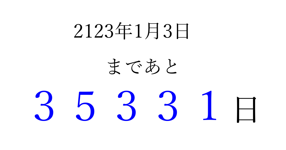 2123年1月3日(日)まで あと 99999 日です 追加すると、トップページからすぐ選べるようになります ※2026/04/10現在の結果です。 最新の状態に更新する ↓シェアして、タイムライン上にカウントダウンを表示しよう!↓ 📤 この結果を共有する Tweet シェア Threads Bluesky 別の日付でカウントダウン 2123年1月のカレンダー このページをブックマークに追加すると、いつでもカウントダウンを確認できます。 (PC: Ctrl+D / Mac: ⌘+D) hitome-notes.comでは以下のページも運営しています。 指定日と期間から日付を計算 | ガチャ確率計算・シミュレーション | プライバシー・ポリシー 運営者:Avocado