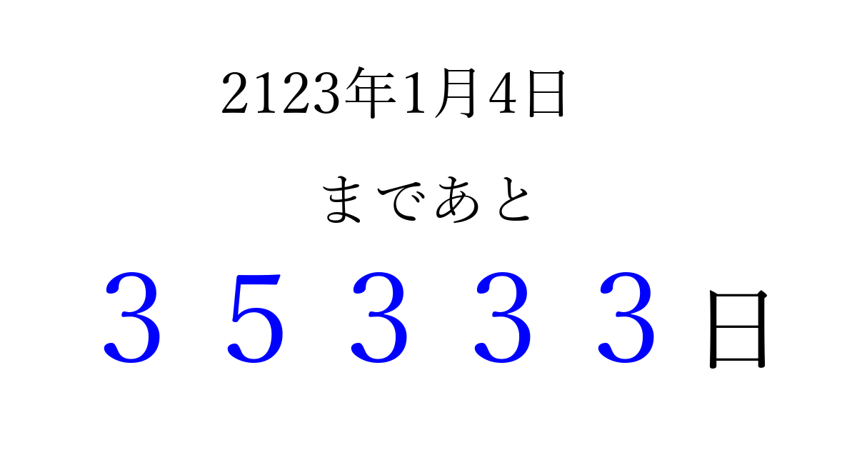 2123年1月4日(月)まで あと 99999 日です 追加すると、トップページからすぐ選べるようになります ※2026/04/09現在の結果です。 最新の状態に更新する ↓シェアして、タイムライン上にカウントダウンを表示しよう!↓ 📤 この結果を共有する Tweet シェア Threads Bluesky 別の日付でカウントダウン 2123年1月のカレンダー このページをブックマークに追加すると、いつでもカウントダウンを確認できます。 (PC: Ctrl+D / Mac: ⌘+D) hitome-notes.comでは以下のページも運営しています。 指定日と期間から日付を計算 | ガチャ確率計算・シミュレーション | プライバシー・ポリシー 運営者:Avocado