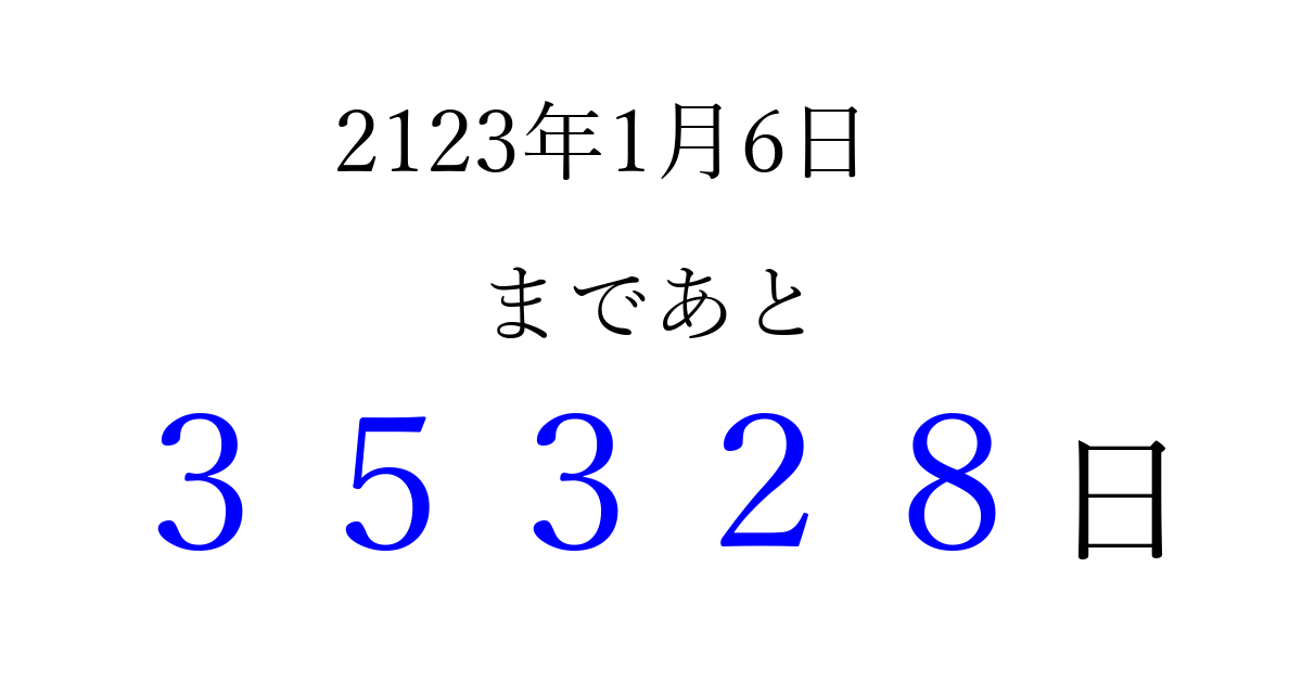 2123年1月6日(水)まで あと 99999 日です 追加すると、トップページからすぐ選べるようになります ※2026/04/16現在の結果です。 最新の状態に更新する ↓シェアして、タイムライン上にカウントダウンを表示しよう!↓ 📤 この結果を共有する Tweet シェア Threads Bluesky 別の日付でカウントダウン 2123年1月のカレンダー このページをブックマークに追加すると、いつでもカウントダウンを確認できます。 (PC: Ctrl+D / Mac: ⌘+D) hitome-notes.comでは以下のページも運営しています。 指定日と期間から日付を計算 | ガチャ確率計算・シミュレーション | プライバシー・ポリシー 運営者:Avocado
