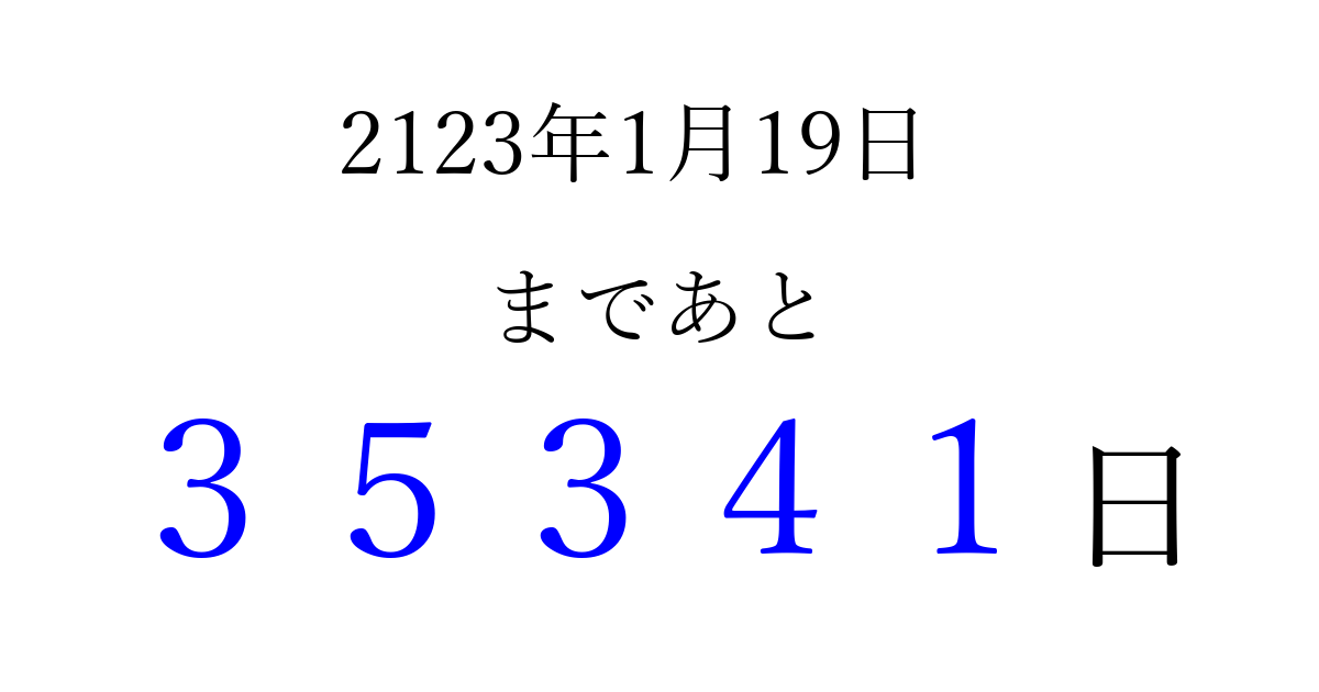 2123年1月19日(火)まで あと 99999 日です 追加すると、トップページからすぐ選べるようになります ※2026/04/16現在の結果です。 最新の状態に更新する ↓シェアして、タイムライン上にカウントダウンを表示しよう!↓ 📤 この結果を共有する Tweet シェア Threads Bluesky 別の日付でカウントダウン 2123年1月のカレンダー このページをブックマークに追加すると、いつでもカウントダウンを確認できます。 (PC: Ctrl+D / Mac: ⌘+D) hitome-notes.comでは以下のページも運営しています。 指定日と期間から日付を計算 | ガチャ確率計算・シミュレーション | プライバシー・ポリシー 運営者:Avocado