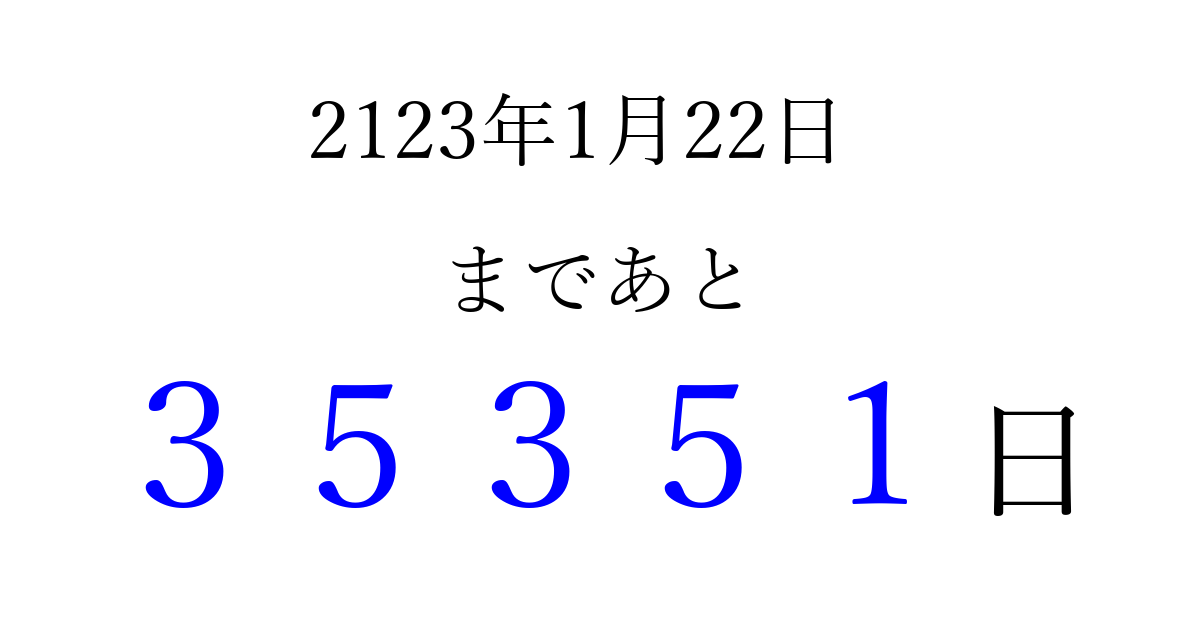 2123年1月22日(金)まで あと 99999 日です 追加すると、トップページからすぐ選べるようになります ※2026/04/09現在の結果です。 最新の状態に更新する ↓シェアして、タイムライン上にカウントダウンを表示しよう!↓ 📤 この結果を共有する Tweet シェア Threads Bluesky 別の日付でカウントダウン 2123年1月のカレンダー このページをブックマークに追加すると、いつでもカウントダウンを確認できます。 (PC: Ctrl+D / Mac: ⌘+D) hitome-notes.comでは以下のページも運営しています。 指定日と期間から日付を計算 | ガチャ確率計算・シミュレーション | プライバシー・ポリシー 運営者:Avocado