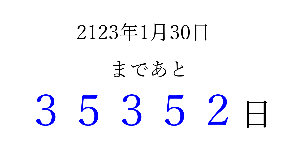 2123年1月30日(土)まで あと 99999 日です 追加すると、トップページからすぐ選べるようになります ※2026/04/16現在の結果です。 最新の状態に更新する ↓シェアして、タイムライン上にカウントダウンを表示しよう!↓ 📤 この結果を共有する Tweet シェア Threads Bluesky 別の日付でカウントダウン 2123年1月のカレンダー このページをブックマークに追加すると、いつでもカウントダウンを確認できます。 (PC: Ctrl+D / Mac: ⌘+D) hitome-notes.comでは以下のページも運営しています。 指定日と期間から日付を計算 | ガチャ確率計算・シミュレーション | プライバシー・ポリシー 運営者:Avocado