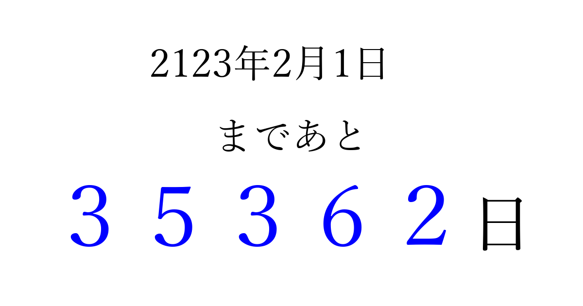 2123年2月1日(月)まで あと 99999 日です 追加すると、トップページからすぐ選べるようになります ※2026/04/08現在の結果です。 最新の状態に更新する ↓シェアして、タイムライン上にカウントダウンを表示しよう!↓ 📤 この結果を共有する Tweet シェア Threads Bluesky 別の日付でカウントダウン 2123年2月のカレンダー このページをブックマークに追加すると、いつでもカウントダウンを確認できます。 (PC: Ctrl+D / Mac: ⌘+D) hitome-notes.comでは以下のページも運営しています。 指定日と期間から日付を計算 | ガチャ確率計算・シミュレーション | プライバシー・ポリシー 運営者:Avocado