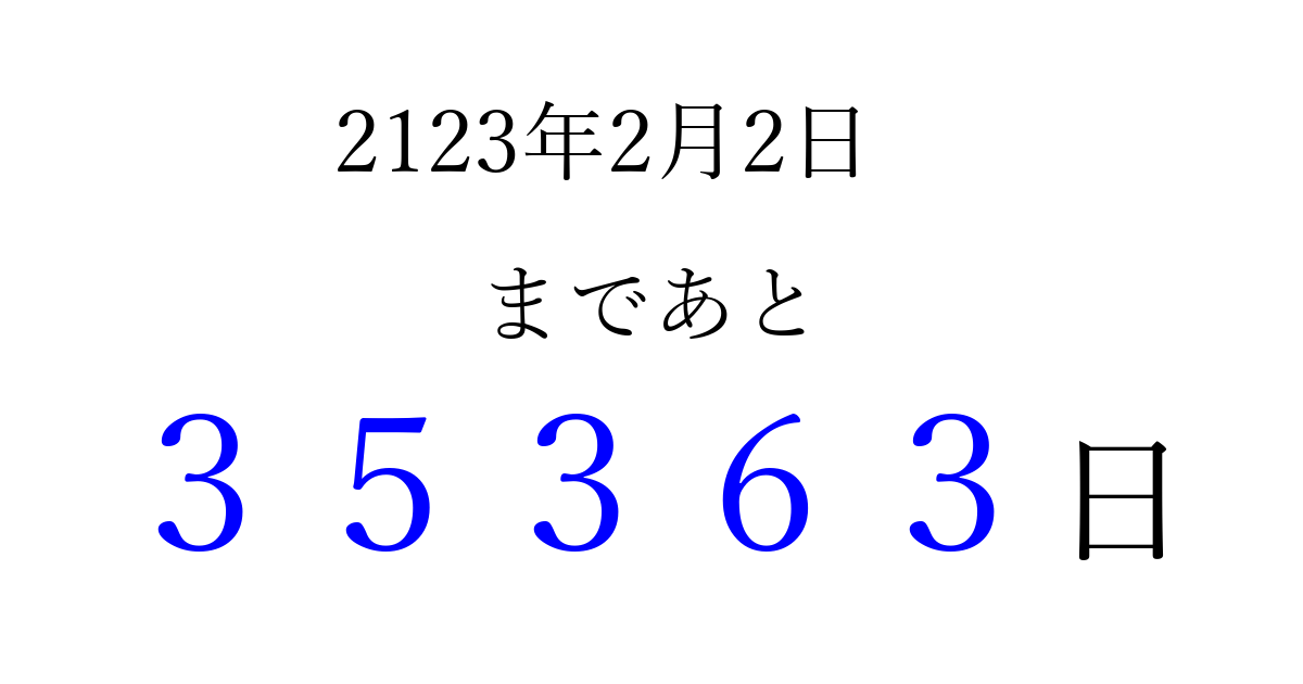 2123年2月2日(火)まで あと 99999 日です 追加すると、トップページからすぐ選べるようになります ※2026/04/08現在の結果です。 最新の状態に更新する ↓シェアして、タイムライン上にカウントダウンを表示しよう!↓ 📤 この結果を共有する Tweet シェア Threads Bluesky 別の日付でカウントダウン 2123年2月のカレンダー このページをブックマークに追加すると、いつでもカウントダウンを確認できます。 (PC: Ctrl+D / Mac: ⌘+D) hitome-notes.comでは以下のページも運営しています。 指定日と期間から日付を計算 | ガチャ確率計算・シミュレーション | プライバシー・ポリシー 運営者:Avocado