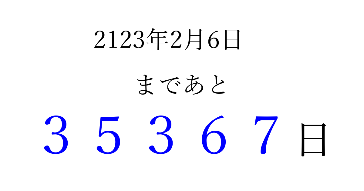 2123年2月6日(土)まで あと 99999 日です 追加すると、トップページからすぐ選べるようになります ※2026/04/08現在の結果です。 最新の状態に更新する ↓シェアして、タイムライン上にカウントダウンを表示しよう!↓ 📤 この結果を共有する Tweet シェア Threads Bluesky 別の日付でカウントダウン 2123年2月のカレンダー このページをブックマークに追加すると、いつでもカウントダウンを確認できます。 (PC: Ctrl+D / Mac: ⌘+D) hitome-notes.comでは以下のページも運営しています。 指定日と期間から日付を計算 | ガチャ確率計算・シミュレーション | プライバシー・ポリシー 運営者:Avocado