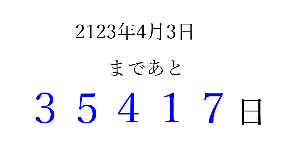 2123年4月3日(土)まで あと 99999 日です 追加すると、トップページからすぐ選べるようになります ※2026/04/14現在の結果です。 最新の状態に更新する ↓シェアして、タイムライン上にカウントダウンを表示しよう!↓ 📤 この結果を共有する Tweet シェア Threads Bluesky 別の日付でカウントダウン 2123年4月のカレンダー このページをブックマークに追加すると、いつでもカウントダウンを確認できます。 (PC: Ctrl+D / Mac: ⌘+D) hitome-notes.comでは以下のページも運営しています。 指定日と期間から日付を計算 | ガチャ確率計算・シミュレーション | プライバシー・ポリシー 運営者:Avocado