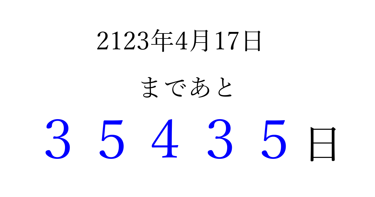 2123年4月17日(土)まで あと 99999 日です 追加すると、トップページからすぐ選べるようになります ※2026/04/10現在の結果です。 最新の状態に更新する ↓シェアして、タイムライン上にカウントダウンを表示しよう!↓ 📤 この結果を共有する Tweet シェア Threads Bluesky 別の日付でカウントダウン 2123年4月のカレンダー このページをブックマークに追加すると、いつでもカウントダウンを確認できます。 (PC: Ctrl+D / Mac: ⌘+D) hitome-notes.comでは以下のページも運営しています。 指定日と期間から日付を計算 | ガチャ確率計算・シミュレーション | プライバシー・ポリシー 運営者:Avocado