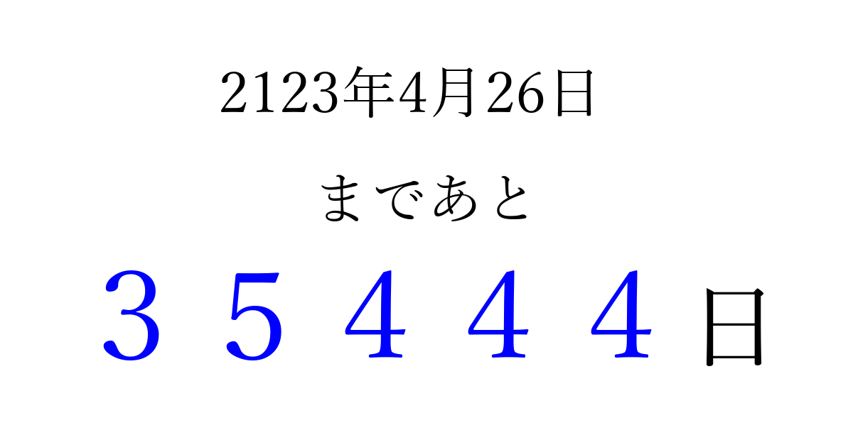 2123年4月26日(月)まで あと 99999 日です 追加すると、トップページからすぐ選べるようになります ※2026/04/10現在の結果です。 最新の状態に更新する ↓シェアして、タイムライン上にカウントダウンを表示しよう!↓ 📤 この結果を共有する Tweet シェア Threads Bluesky 別の日付でカウントダウン 2123年4月のカレンダー このページをブックマークに追加すると、いつでもカウントダウンを確認できます。 (PC: Ctrl+D / Mac: ⌘+D) hitome-notes.comでは以下のページも運営しています。 指定日と期間から日付を計算 | ガチャ確率計算・シミュレーション | プライバシー・ポリシー 運営者:Avocado