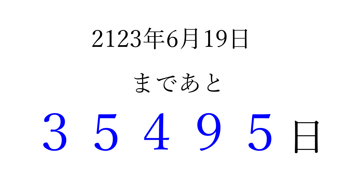 2123年6月19日(土)まで あと 99999 日です 追加すると、トップページからすぐ選べるようになります ※2026/04/13現在の結果です。 最新の状態に更新する ↓シェアして、タイムライン上にカウントダウンを表示しよう!↓ 📤 この結果を共有する Tweet シェア Threads Bluesky 別の日付でカウントダウン 2123年6月のカレンダー このページをブックマークに追加すると、いつでもカウントダウンを確認できます。 (PC: Ctrl+D / Mac: ⌘+D) hitome-notes.comでは以下のページも運営しています。 指定日と期間から日付を計算 | ガチャ確率計算・シミュレーション | プライバシー・ポリシー 運営者:Avocado