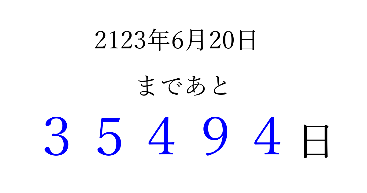 2123年6月20日(日)まで あと 99999 日です 追加すると、トップページからすぐ選べるようになります ※2026/04/15現在の結果です。 最新の状態に更新する ↓シェアして、タイムライン上にカウントダウンを表示しよう!↓ 📤 この結果を共有する Tweet シェア Threads Bluesky 別の日付でカウントダウン 2123年6月のカレンダー このページをブックマークに追加すると、いつでもカウントダウンを確認できます。 (PC: Ctrl+D / Mac: ⌘+D) hitome-notes.comでは以下のページも運営しています。 指定日と期間から日付を計算 | ガチャ確率計算・シミュレーション | プライバシー・ポリシー 運営者:Avocado