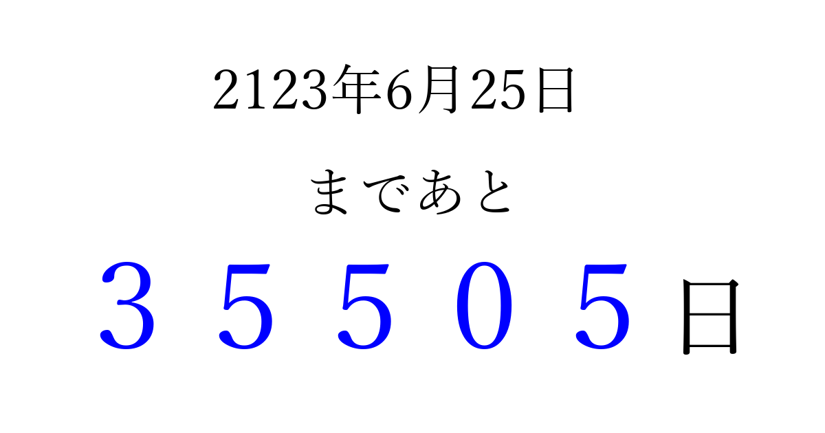 2123年6月25日(金)まで あと 99999 日です 追加すると、トップページからすぐ選べるようになります ※2026/04/09現在の結果です。 最新の状態に更新する ↓シェアして、タイムライン上にカウントダウンを表示しよう!↓ 📤 この結果を共有する Tweet シェア Threads Bluesky 別の日付でカウントダウン 2123年6月のカレンダー このページをブックマークに追加すると、いつでもカウントダウンを確認できます。 (PC: Ctrl+D / Mac: ⌘+D) hitome-notes.comでは以下のページも運営しています。 指定日と期間から日付を計算 | ガチャ確率計算・シミュレーション | プライバシー・ポリシー 運営者:Avocado
