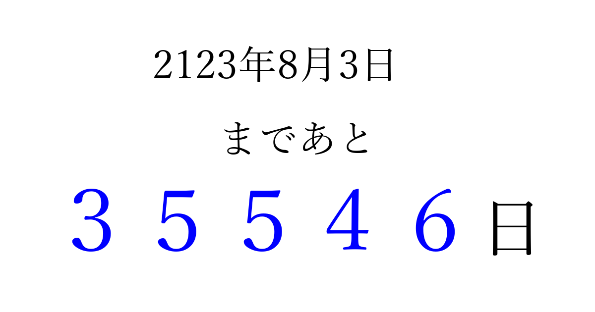 2123年8月3日(火)まで あと 99999 日です 追加すると、トップページからすぐ選べるようになります ※2026/04/07現在の結果です。 最新の状態に更新する ↓シェアして、タイムライン上にカウントダウンを表示しよう!↓ 📤 この結果を共有する Tweet シェア Threads Bluesky 別の日付でカウントダウン 2123年8月のカレンダー このページをブックマークに追加すると、いつでもカウントダウンを確認できます。 (PC: Ctrl+D / Mac: ⌘+D) hitome-notes.comでは以下のページも運営しています。 指定日と期間から日付を計算 | ガチャ確率計算・シミュレーション | プライバシー・ポリシー 運営者:Avocado